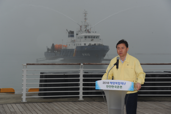 김영춘장관이 5월17일 여수 신항해상에서 중앙정부-지자체-유관기관등이 참석하여 '안전한 바다,행복한 국민'이라는 비전으로 조수-태풍내습-해양오염의 복합재난에 대한 대응태세 확립을 위한 2018 해양복합재난 안전한국 현장훈련을 실시 계획(사진=해양수산부 제공)