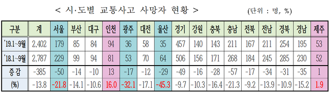 울산은 올해 9월말 기준 교통사고 사망자 수가 전년 동기(64명) 대비 45.3% 감소한 35명으로 제일 많이 감소했으며, 광주(32.1%)와 서울(-21.8%)이 그 뒤를 이었다.