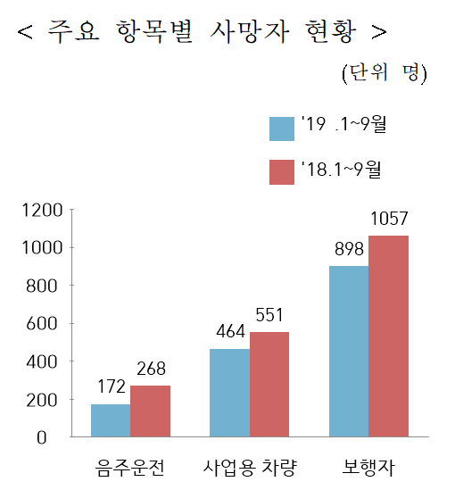 음주운전 사망자 수는 올해 9월 말 기준 172명으로 전년 동기 268명보다 96명(35.8%)이 감소했고, 사업용차량 사망자 수는 464명으로 전년 동기 551명보다 87명(15.8%) 감소, 보행자 사망자 수는 898명으로 전년 동기 1057명 보다 159명(15.0%) 감소했다.