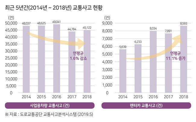 특히 사업용 자동차의 교통사고 발생건수는 연평균 1.6% 감소한데 반해 렌터카 교통사고 건수는 5639건에서 8593건으로, 오히려 연평균 11.1% 증가한 것으로 나타났다.