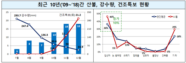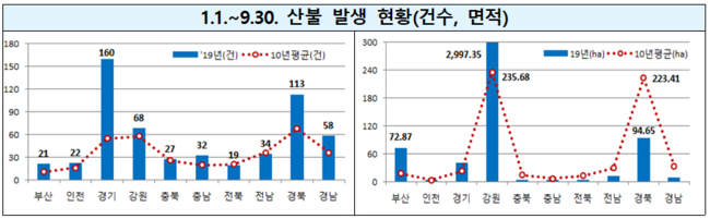 최근 10년간 연평균 432건의 산불이 발생했으며 670ha의 산림이 소실됐다. 특히 올해 1월 1일부터 9월 30일까지 594건의 산불이 발생해 예년보다 1.6배 많은 산불이 발생했으며 피해면적도 2019년 현재까지 3,247ha로 예년보다 5.1배 증가했다.