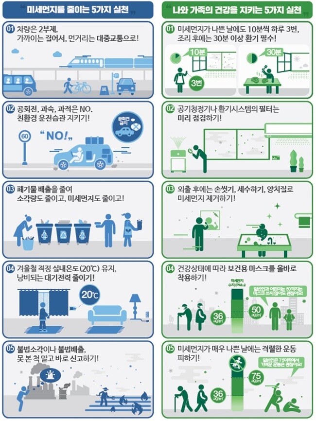마스크도 노인이나 임산부, 기저질환자 등 취약계층은 PM2.5 36㎍/㎥ 이상일 때 보건용으로 써야 한다. 일반인과 어린이는 PM2.5 50㎍/㎥까지는 마스크를 쓰지 않아도 된다.
