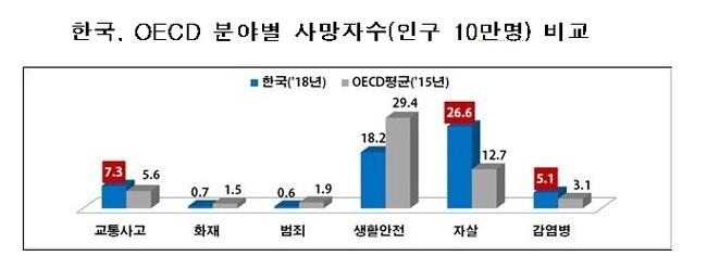 우리나라는 경제협력개발기구(OECD) 국가 평균과 비교해 화재와 범죄, 생활안전은 양호한 수준이나 교통사고와 자살, 감염병 등에서 떨어졌다. 특히 자살 분야는 OECD 평균과 2배 이상 차이가 나 중점 관리가 필요한 것으로 나타났다.