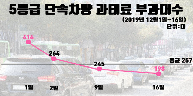 시에 따르면 지난 16일간 총 단속차량이 4091대에 이르는 가운데, 첫날 416대의 차량이 단속된 이후 9일 245대, 16일 198대로 꾸준히 감소하고 있다.