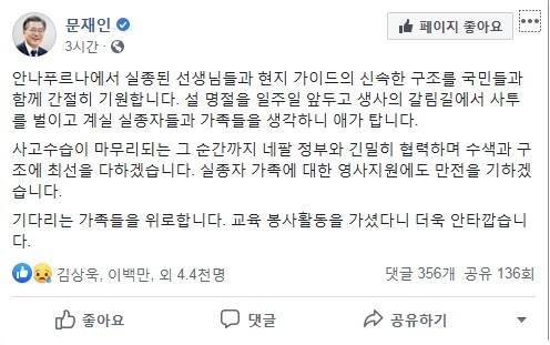 문 대통령은 이날 페이스북에 남긴 글(사진)에서 “안나푸르나에서 실종된 선생님들과 현지 가이드의 신속한 구조를 국민들과 함께 간절히 기원한다”면서 “설 명절을 일주일 앞두고 생사의 갈림길에서 사투를 벌이고 계실 실종자들과 가족들을 생각하니 애가 탄다”고 말했다.