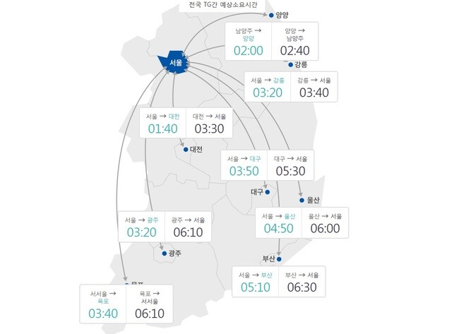 각 지방에서 서울까지 소요되는 시간(톨게이트 기준)은 부산에서 7시간, 광주 6시간20분, 목포 6시간40분, 대구 5시간, 대전 2시간40분 가량이다.
