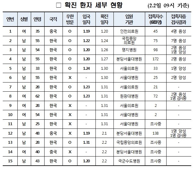 43세 남성인 15번째 환자는 지난달 20일 우한에서 입국하여 능동감시 중이던 대상자로, 전날부터 경미한 감기증상을 호소해 검사한 결과 확진판정났다.