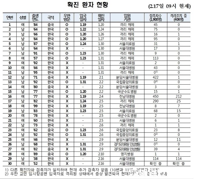 17일 질병관리본부 중앙대책본부에 따르면 이날 새로 코로나19 양성으로 확인된 30번째 환자(52년생·한국 국적)는 29번 환자의 배우자로, 29번 환자 접촉자를 대상으로 한 검사에서 확진됐다. 현재 서울대병원에 격리입원 중이며, 상태는 안정적이다.