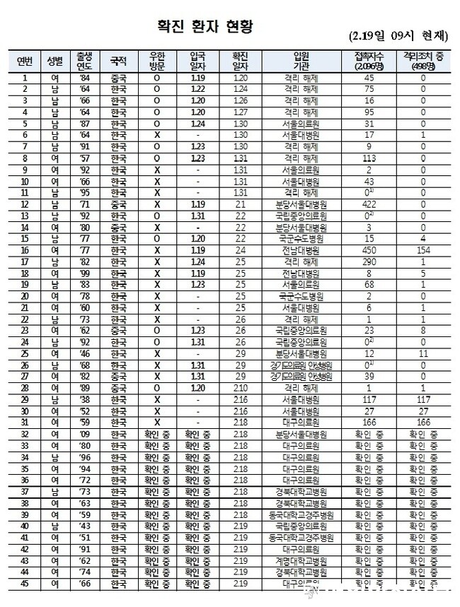 질병관리본부 중앙방역대책본부는 19일 오전 9시 현재 국내 코로나19 확진환자가 15명이 추가로 늘어 46명이라고 밝혔다.