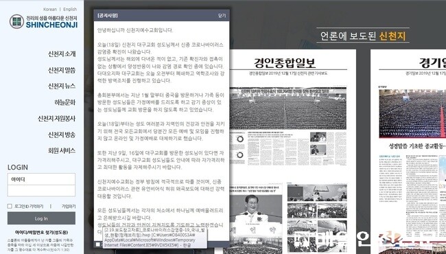 신천지교회 측은 홈페이지에 올린 공지사항을 통해 “총회본부에서는 지난 1월 말부터 중국을 방문하거나 가족 등이 방문한 성도님들은 가정예배를 드리도록 하고 감기 증상이 있는 성도에게 교회 방문을 하지 않도록 하고 있었다”면서 “전국 모든교회에서 당분간 모든 예배 및 모임을 진행하지 않고 온라인 및 가정예배로 대체하기로 했다”고 소개했다.