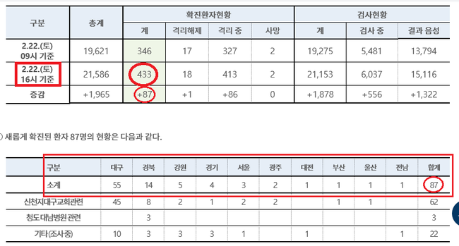 22일 질병관리본부는 오후4시 기준 국내 코로나 확진자 수는 총 433명으로 발표했다. 이날 오전 346명보다도 87명 늘어난 숫자다. 오늘 하루 확진자수는 전날 대비 229명이나 급증했다.