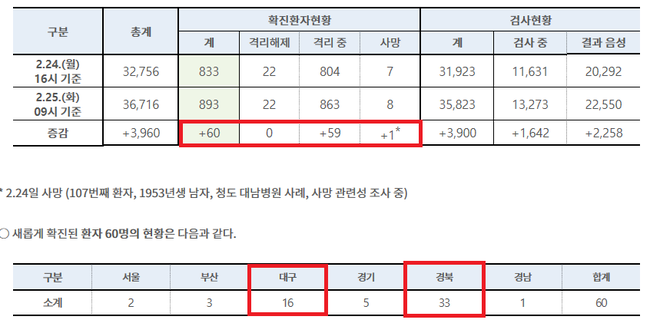 새로 추가된 60명 중 경북에서 발생한 확진자가 33명에 이른다. 이어 대구에서 16명, 경기 5명, 부산 3명, 서울 2명, 경남 1명의 확진자가 나왔다.