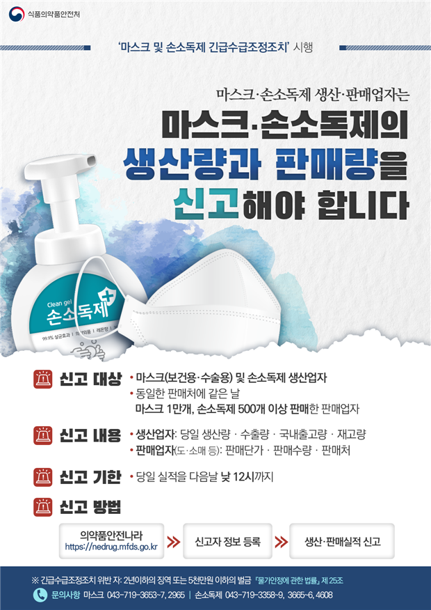 식품의약품안전처는 26일부터 ‘마스크 및 손소독제 긴급수급조정조치’를 시행한다고 25일 밝혔다.