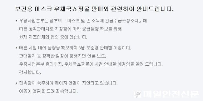 공적판매처로 지정된 우체국 홈쇼핑이 마스크 물량을 확보하여 3월 초에 판매할 예정이라고 밝히자 접속자들이 몰리면서 홈페이지가 마비됐다.