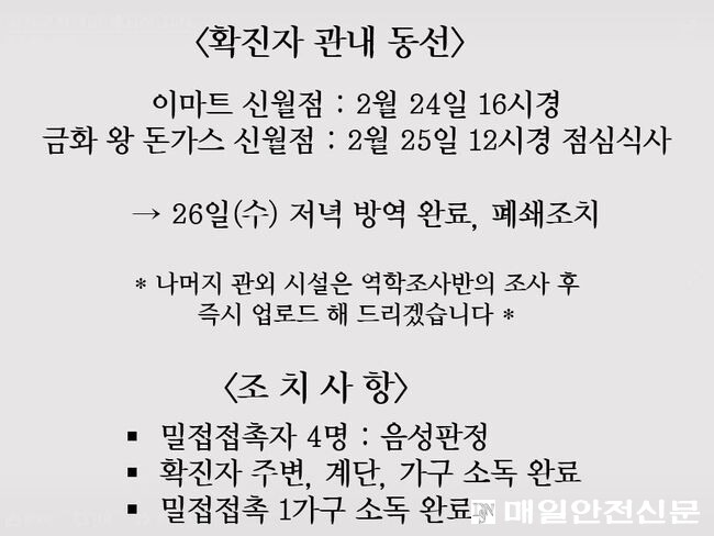 [매일안전신문, 강수진 기자] 지난 26일 서울 양천구에서 발생한 첫 확진환자의 동선이 간략하게 공개됐다.