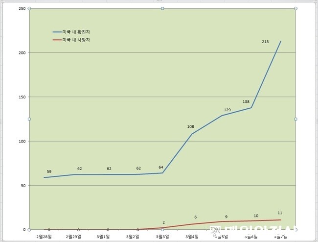 보건복지부가 매일 WHO상황보고서를 근거로 발표하는 자료에 따르면 미국 내 확진환자는 지난달 23일 35명 수준에서 28일 59명으로 늘어 지난 3일까지 64명 수준을 보였으나 4일부터 100명을 넘어섰다. 4일 108명, 5일 129명, 6일 148명, 7일 213명이다. 지난 2일까지 한명도 없던 사망자도 3일 2명에서 4일 6명, 5일 9명, 6일 10명, 7일 11명으로 늘었다.