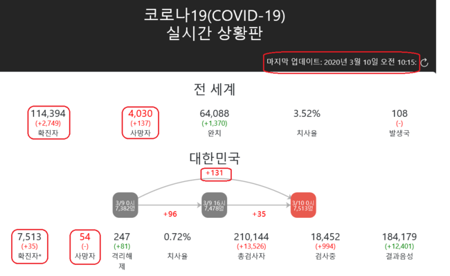 질병관리본부는 10일 코로나19 확진자는 9일 기준으로 131명 증가되어 총 7513명이라고 발표했다. 전세계적으로 확진자는 11만4394명이다.