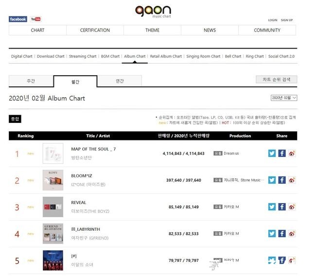 한편, 가온차트가 발표한 2020년 2월 월간 앨범차트에 따르면 1위를 차지한 방탄소년단을 뒤이어 아이즈원(IZ*ONE)의 첫 정규앨범 ‘BLOOM*IZ’(39만7640장)가 2위, 더보이즈(THE BOYZ)의 첫 정규앨범 ‘REVEAL’(8만5149장)가 3위를 차지했다.