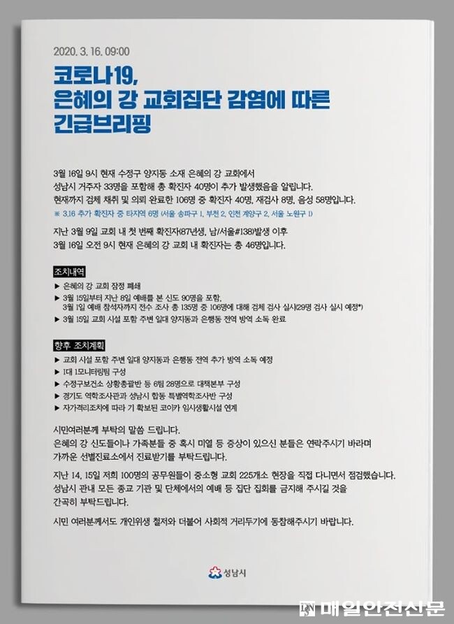 은 시장은 "16일 오전 7시 현재 성남시 수정구 양지동 소재 '은혜의 강'교회에서 성남시 거주자 34명을 포함해 총 확진자 40명이 추가 발생했다"고 발표했다.