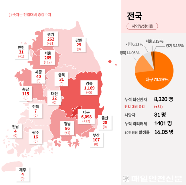 [매일안전신문] 17일 질병관리본부는 일 0시 기준 국내 확진자는 84명 증가하여 8320명이다. 사망자는 6명 추가되어 총 81명이다.