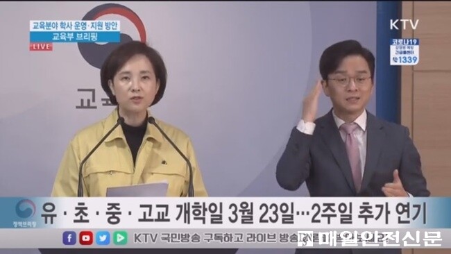 유은혜 부총리 겸 교육부장관은 17일 오후 2시 기자회견을 열어 전국의 모든 유치원과 어린이집, 초·중·고등학교 및 특수학교의 2020학년도 신학기 개학일을 오는 23일에서 4월6일로 2주간 추가 연기한다고 발표했다. 개학일이 2일에서 9일로, 9일에서 23일로 미뤄진 데 이어 3번째 연기 결정이다.