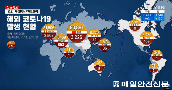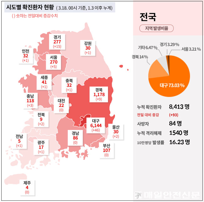 [매일안전신문 김혜연 기자] 질병관리본부는 코로나19 확진자가 18일 0시 기준 전일대비 93명이 추가되어 총 8413명이라고 발표했다. 사망자는 3명 추가되어 누적 사망자는 84명이다. 격리해제자는 139명 증가해 완치자가 총 1540명으로 늘었다.