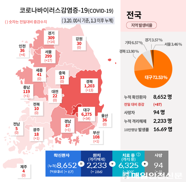 [매일안전신문] 질병관리본부는 20일 0시 기준 전날 코로나19 추가 확진자는 87명으로 누적 확진자는 총 8652명으로 발표했다.