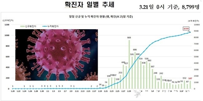 중앙방역대책본부는 21일 오전 0시 기준으로 코로나19 신규 확진자가 전날에 비해 147명 늘어 전체 확진자가 총 8799명이라고 밝혔다.