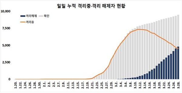 코로나19로 격리해제된 인원은 4528명에서 4811명으로 283명 늘어난 반면 격리중인 확진자는 4665명에서 4523명으로 142명이 감소했다. 완치된 인원(4811명)이 치료중인 인원(4523명)을 처음으로 앞지른 것이다.