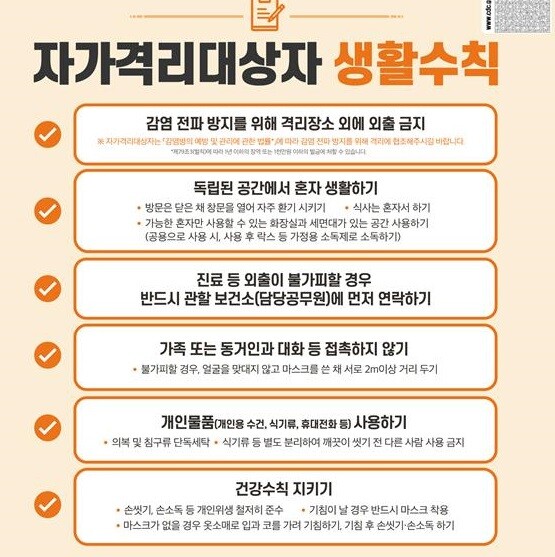 또 독립된 공간에서 혼자 생활하기를 실천해야 하는데, 가족이나 동거인과 대화 등 접촉도 삼가야 한다. 부득이한 경우 마스크를 쓴채 2m 이상 떨어져야 한다. 방문을 닫은채 창문을 열어 자주 환기시키고 식사는 혼자하고 가능한 혼자 쓰는 화장실과 세면대가 있는 공간에 있어야 한다. 공용을 쓴다면 사용 후 락스 등 가정용 소독제로 소독해야 한다. 수건이나 식기류, 휴대전화 등도 반드시 혼자 쓰도록 주의해야 한다.