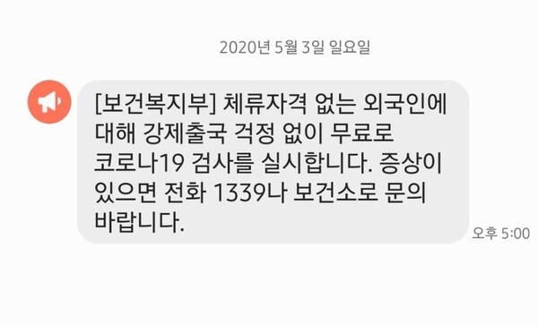 보건복지부는 3일 이같은 내용의 재난문자를 국민들에게 보냈다. 코로나19 증상이 있는 불법체류 외국인들이 검사를 받지 않아 ‘조용한 전파자’로서 사각지대에 놓이지 않도록 하겠다는 뜻이다.