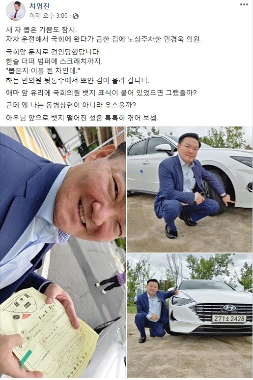 차 전 의원은 이어 “한술 더떠 범퍼에 스크래치까지....‘뽑은지 이틀 된 차인데’ 하는 민 의원 뒷통수에서 뽀얀 김이 올라간다. 애마 앞 유리에 국회의원 뱃지 표식이 붙어 있었으면 그랬을까? 근데 왜 나는 동병상련이 아니라 우스울까?”라며 “앞으로 뱃지 떨어진 설움 톡톡히 겪어 보셈”이라고 적었다. /신윤희 기자