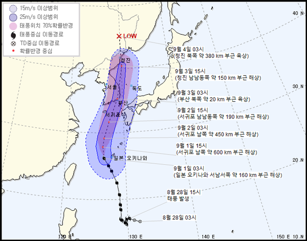 태풍은 북태평양고기압 가장자리를 따라 북상, 오늘 늦은 밤 제주도남쪽먼바다를 시작으로 3일까지 전국에 영향을 미칠 것으로 보인다. 전국에 매우 강한 바람과 함께 최고 400㎜ 매우 많은 비가 내리는 곳이 있겠다.
