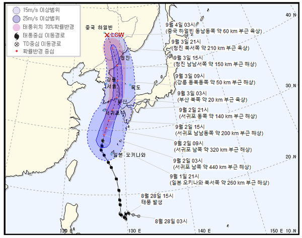 1일 늦은 밤 제주도 남쪽 먼바다를 시작으로 3일까지 전국이 태풍의 영향권에 들겠고 경상도와 제주도, 강원 영동을 중심으로 매우 많은 비와 함께 매우 강한 바람이 불겠으니 시설물 관리와 안전사고에 각별히 유의해야 한다.