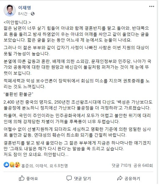 이 지사는 이날 페이스북에 ‘미안합니다’라는 글을 올려 “젊은 남편이 너무 살기 힘들어 아내와 함께 결혼반지를 팔고 돌아와, 반대쪽으로 몸을 돌리고 밤새 하염없이 우는 아내의 어깨를 싸안고 같이 울었다는 글을 보았다. 짧은 글을 읽는 동안 어느새 제 눈에서도 눈물이 나네요”라며 “그러나 이 젊은 부부와 같이 갑자기 사정이 나빠진 사람은 이번 지원의 대상이 못될 가능성이 높다”고 전했다.