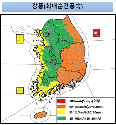 강원영동과 경상도, 제주도에서는 최대순간풍속 90~145㎞/h(25~40m/s)의 바람이, 울릉도·독도에선 180㎞/h(50m/s) 이상의 매우 강한 바람이 부는 곳이 있겠다.