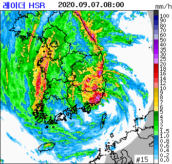 7일 기상청에 따르면 태풍 하이선은 오전 8시 현재 부산 남동쪽 약 40㎞ 해상까지 접근해 시속 41㎞로 북진하고 있다. 중심기압은 955hPa, 최대풍속은 144㎞/h(40m/s)이다.
