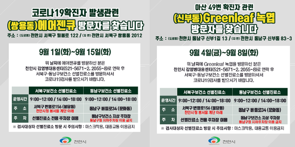 이에 시는 지난 1일부터 15일 기간 중 에어젠큐를 방문한 사람과 지난 4일부터 8일 사이 그린리프 녹엽을 방문한 사람들은 코로나19 검사를 받을 것을 권고했다.