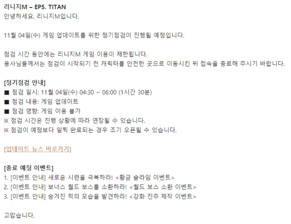 리니지M은 4일 수요일 오전 4시 30분부터 6시까지 1시간 30분동안 정기점검을 진행한다고 밝혔다.
