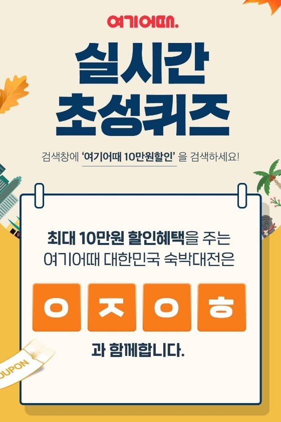 여기어때 10만원 할인 이벤트는 "최대 10만원 할인혜택을 주는 여기어때 대한민국 숙박대전은 ㅇㅈㅇㅎ과 함께합니다." 이 문제로 나왔다.