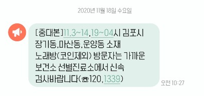 [매일안전신문] 중앙재난안전대책본부는 18일 재난문자를 통해 “김포시 장기동·마산동·운양동 소재 노래방(코인제외) 방문자는 가까운 보건소 선별진료소에서 신속 검사 바란다”고 전했다.