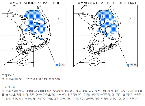 기상청은 이날 밤 11시를 기해 △경기도 여주, 가평, 양평, 광주, 안성, 이천, 용인, 남양주, 파주, 의정부, 양주, 포천, 연천, 동두천 △강원도 북부및 중부, 남부 산지, 양구 및 평창·홍천·인제 평지, 횡성, 춘천, 화천, 철원 △충북 △충남 계룡, 청양, 공주, 천안 △경북 북동산지와 영양·봉화평지, 청도, 청송, 의성, 영주, 안동, 예천, 김천, 고령, 군위에 한파주의보를 발령했다.