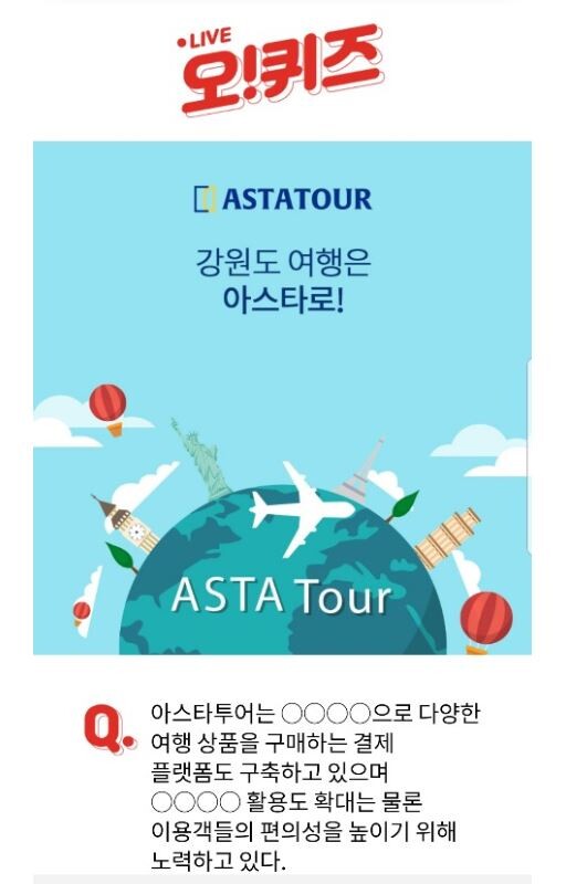 문제는 "아스타투어는 0000으로 다양한 여행상품을 구매하는 결재 플랫폼도 구축하고 있으며 0000 활용도 확대는 물론 이용객들의 편의성을 높이기 위해 노력하고 있다" 이다. 정답은 '가상자산'이다.