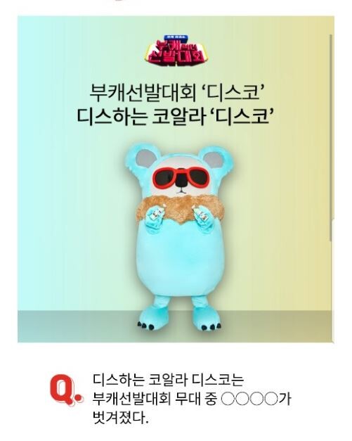 문제는 " 디스하는 코알라 디스코는 부캐선발대회 무대중 0000가 볏겨졌다 "이다. 정답은 '선글라스' 이다.