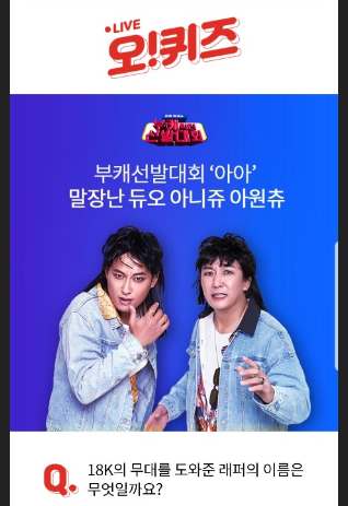 24일 오후 9시 오퀴즈 문제는 “18K의 무대를 도와준 래퍼의 이름은 무엇일까요”이다.