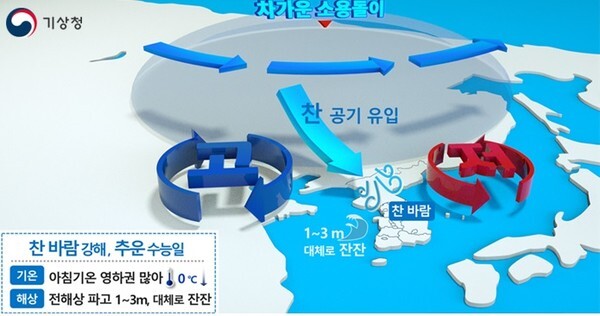 금요일인 4일은 5km 상공을 통과하는 –20℃ 안팎의 찬 공기가 우리나라 북동쪽에 저기압을 발달시켜 우리나라 부근의 대륙고기압과 기압차가 커지기 때문에 북풍이 강해지고, 찬 공기의 유입도 더욱 활발해질 것으로 전망된다.