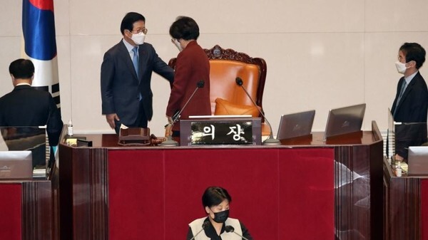 [매일안전신문] 박병석 국회의장이 12일 새벽 3시15분 즈음 무제한 토론 중에 있는 본회의를 잠시 중단시켰다. 윤희숙 국민의힘 의원이 필리버스터를 하고 있는 와중이었는데 급하게 코로나 확진자와 접촉한 의원이 있었다는 보고를 받고 조치에 나선 것이다.