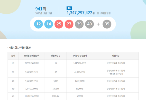 로또 941회 당첨번호 6개를 모두 맞힌 1등 당첨자는 16명이며 각 1,347,297,422원의 당첨금을 받는다.