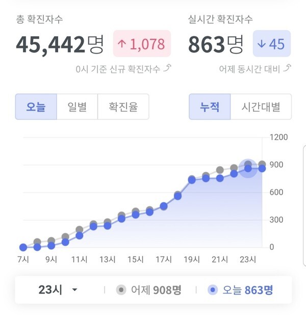 전날 신규 확진자는 1078명으로 누적 확진자는 4만5442명이었다, 이날 11씨까지 신규 확진자를 포함하면 명이 4만6305명이다.