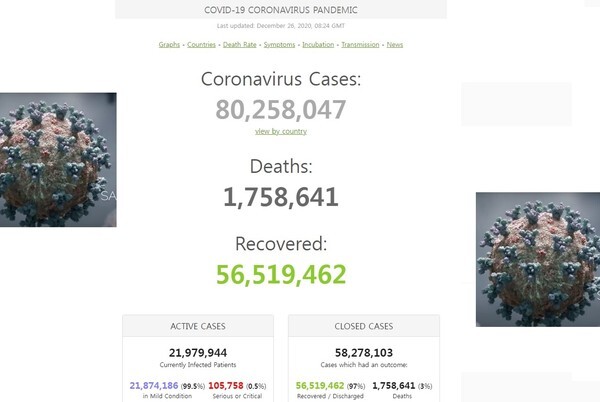 26일 국제통계사이트 월드오미터에 따르면 오전 8시24분(그리니치표준시·GMT) 현재 세계 코로나19 누적 확진자는 8025만8047명으로 집계됐다. 78억여명으로 추산되는 세계 인구의 1% 넘는 인원이 코로나19에 감염된 셈이다.